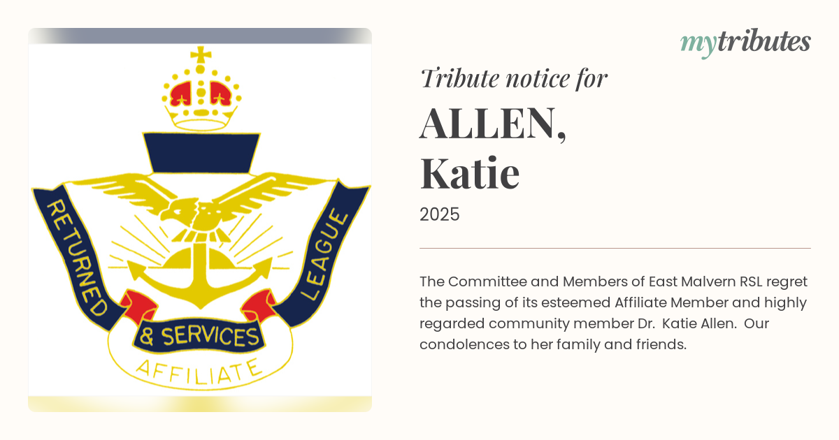 17°CThe Committee and Members of East Malvern RSL regret the passing of its esteemed Affiliate Member and highly regarded community member Dr. Katie Allen. Our condolences to her family and friends.