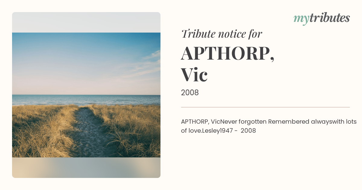 APTHORP, VicNever forgotten Remembered alwayswith lots of love.Lesley1947 - 2008