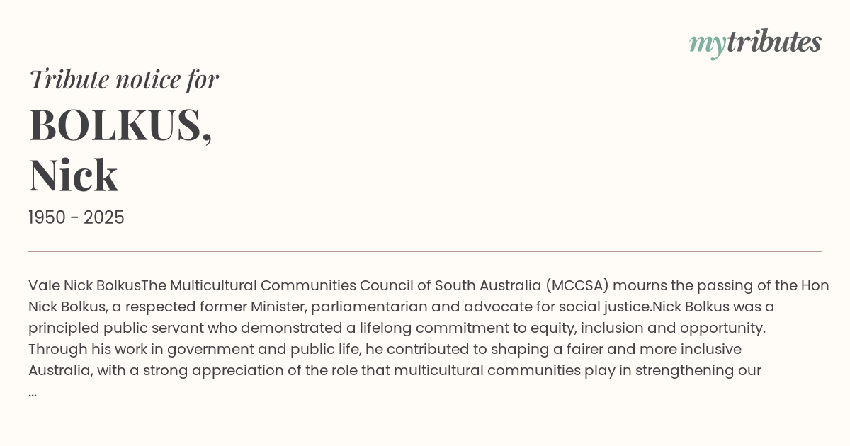 Nick Bolkus was a principled public servant who demonstrated a lifelong commitment to equity, inclusion and opportunity. Through his work in government and public life, he contributed to shaping a fairer and more inclusive Australia, with a strong appreciation of the role that multicultural communities play in strengthening our nation.