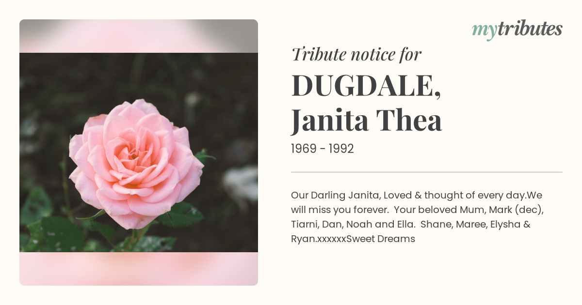 We will miss you forever. Your beloved Mum, Mark (dec), Tiarni, Dan, Noah and Ella. Shane, Maree, Elysha & Ryan.
