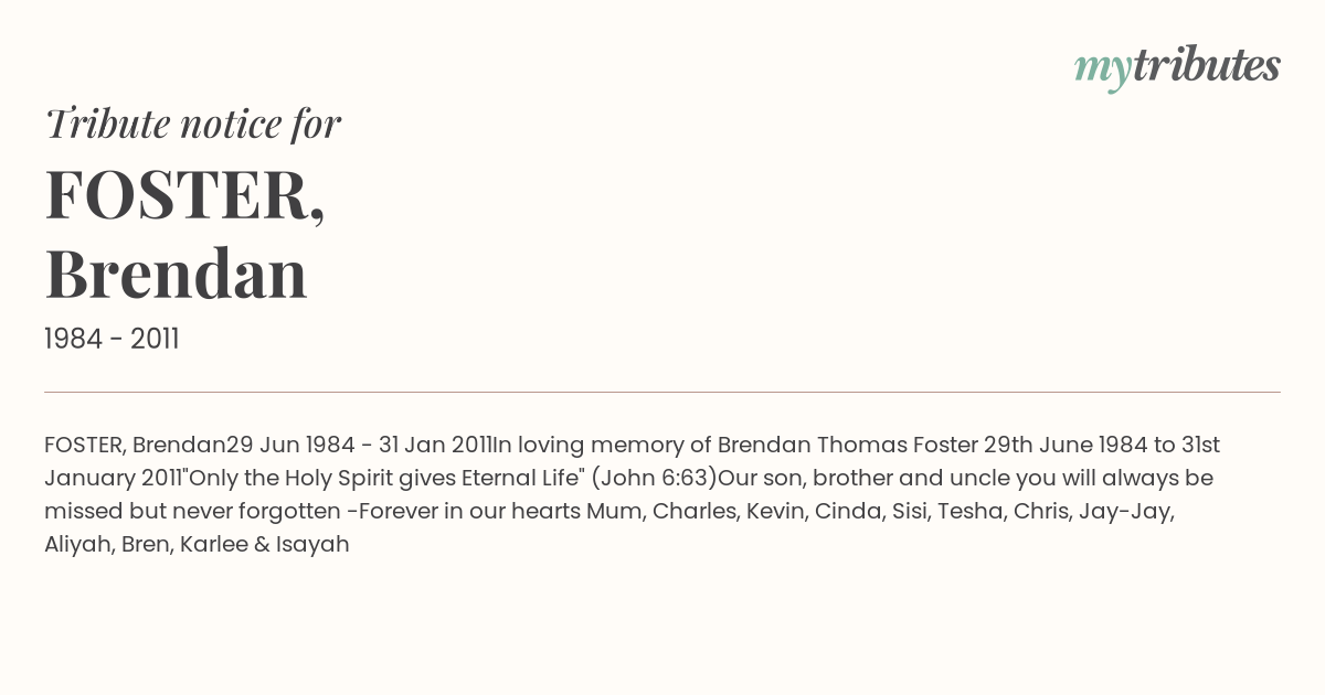 In loving memory of Brendan Thomas Foster 29th June 1984 to 31st January 2011