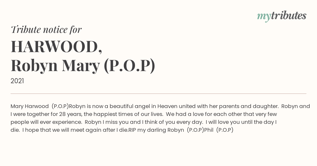 Robyn is now a beautiful angel in Heaven united with her parents and daughter. Robyn and I were together for 28 years, the happiest times of our lives. We had a love for each other that very few people will ever experience. Robyn I miss you and I think of you every day. I will love you until the day I die. I hope that we will meet again after I die.