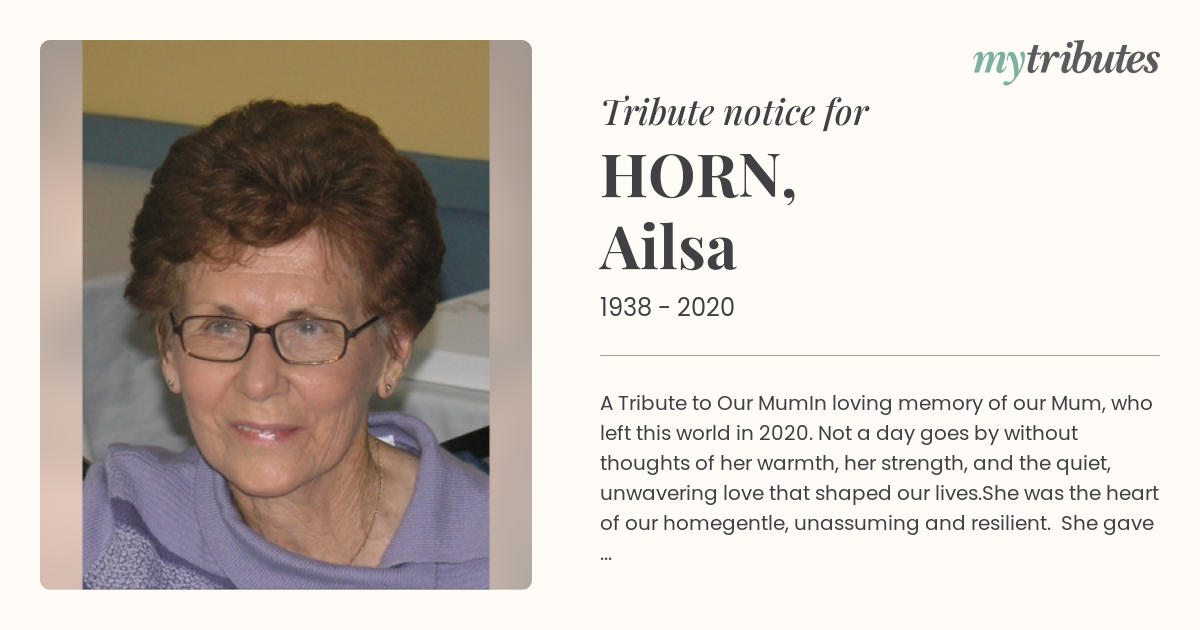 In loving memory of our Mum, who left this world in 2020. Not a day goes by without thoughts of her warmth, her strength, and the quiet, unwavering love that shaped our lives.