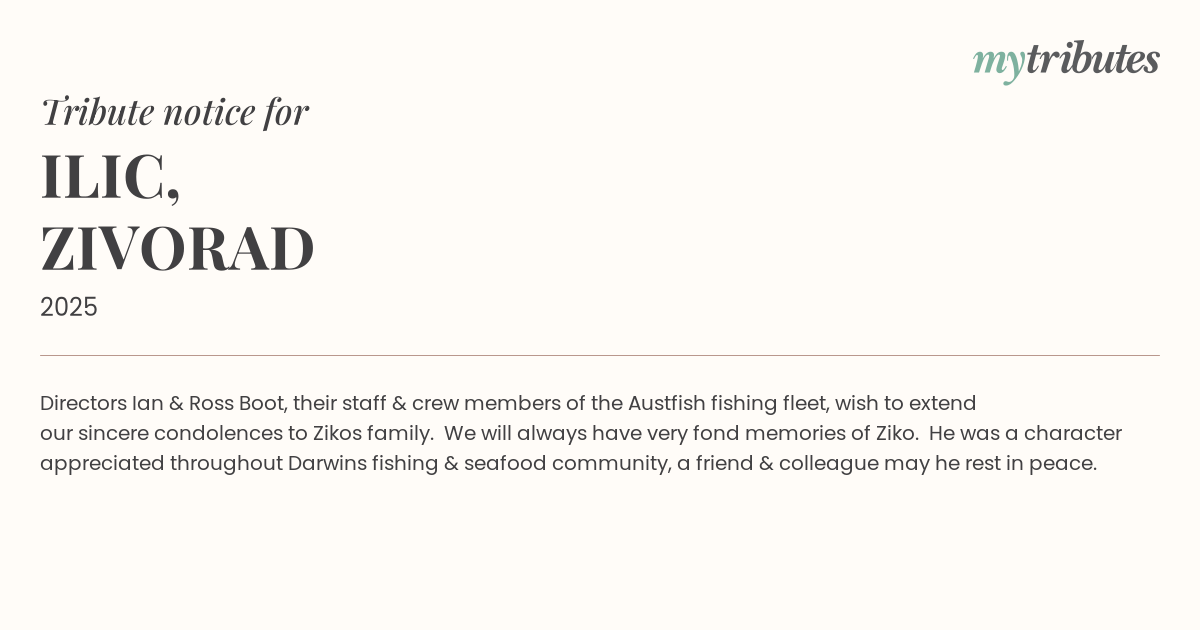 17°CDirectors Ian & Ross Boot, their staff & crew members of the Austfish fishing fleet, wish to extend our sincere condolences to Ziko’s family.