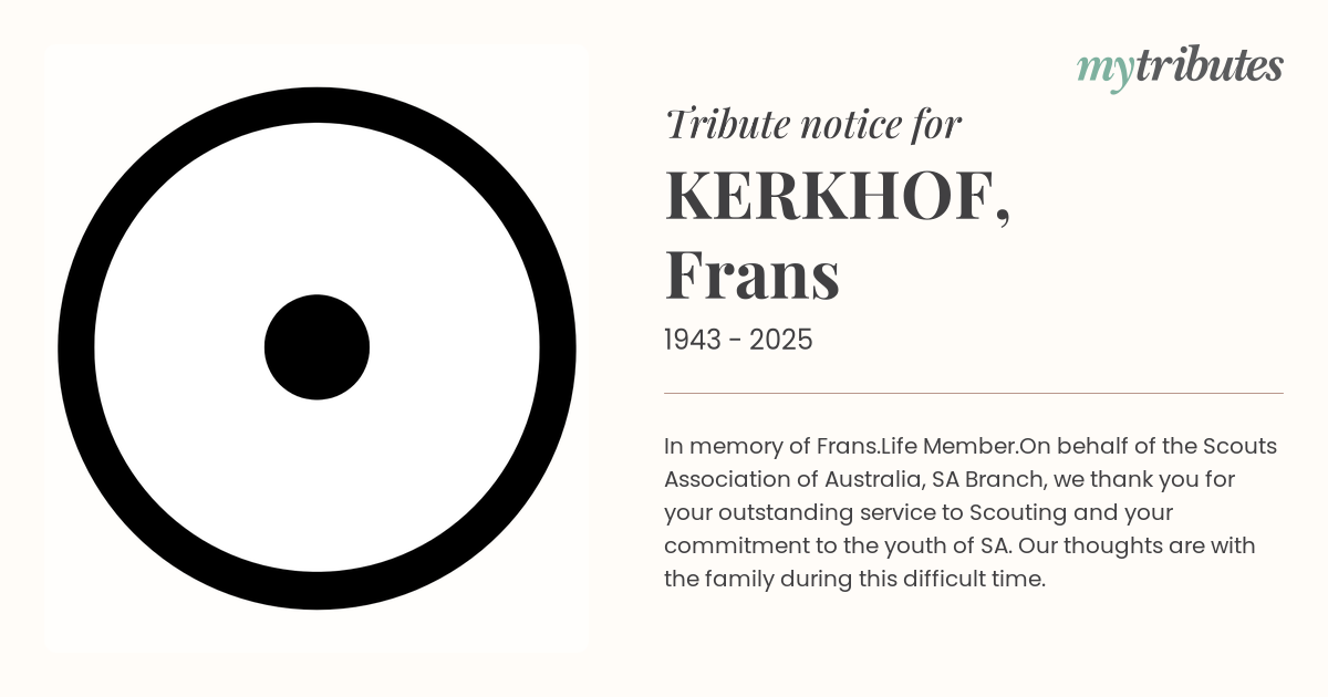 On behalf of the Scouts Association of Australia, SA Branch, we thank you for your outstanding service to Scouting and your commitment to the youth of SA. Our thoughts are with the family during this difficult time.
