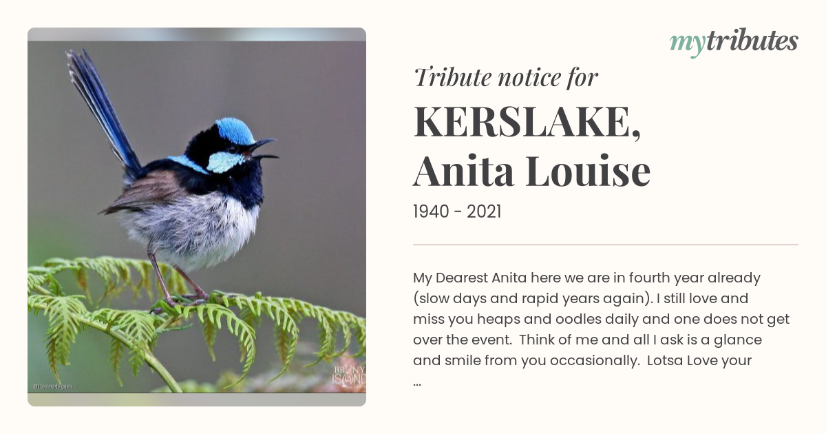 17°CMy Dearest Anita here we are in fourth year already (slow days and rapid years again). I still love and miss you heaps and oodles daily and one does not get over the event. Think of me and all I ask is a glance and smile from you occasionally. Lotsa Love your Christopher John xx/oo.