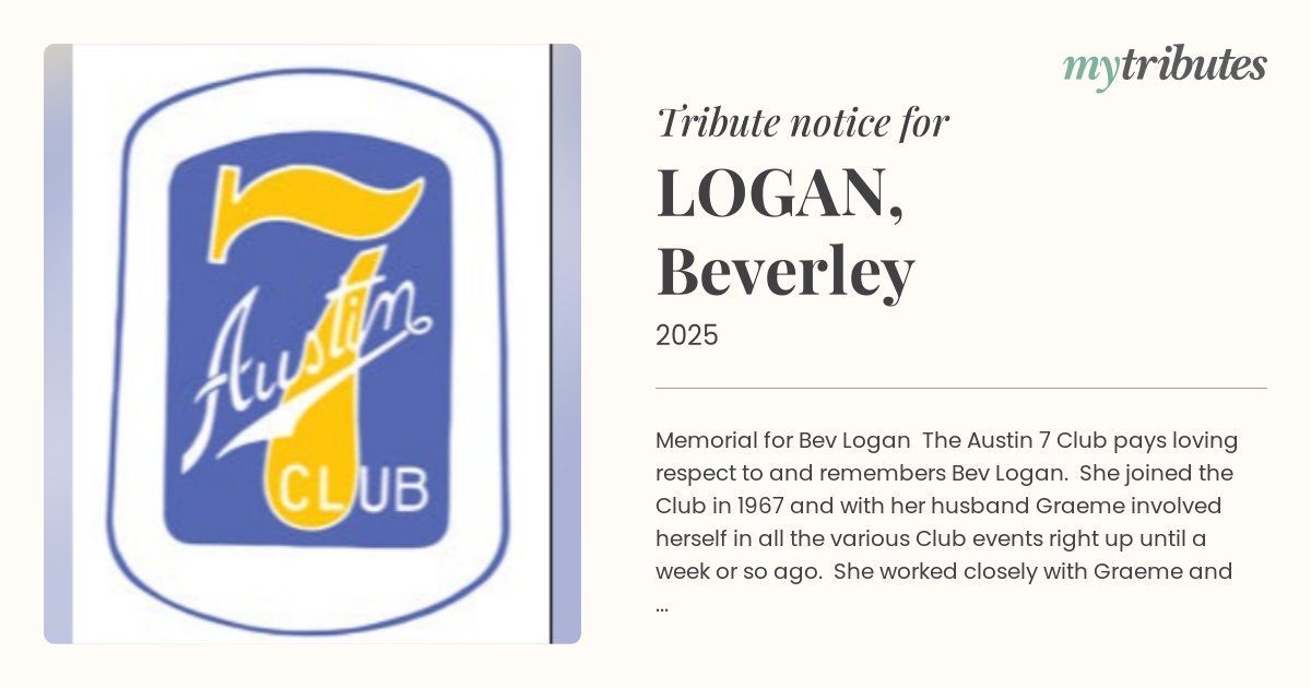 The Austin 7 Club pays loving respect to and remembers Bev Logan. She joined the Club in 1967 and with her husband Graeme involved herself in all the various Club events right up until a week or so ago. She worked closely with Graeme and supported him in all his club activities. We remember her bright and cheerful disposition. Members will miss her greatly