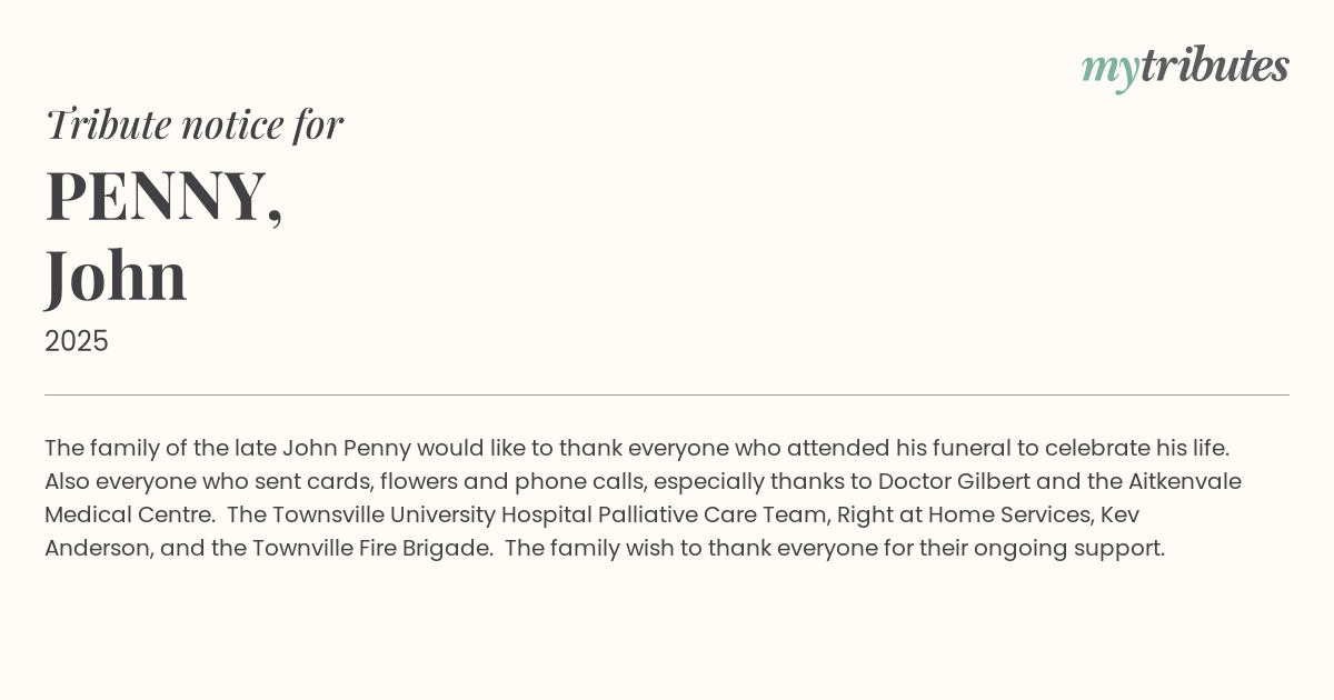 17°CThe family of the late John Penny would like to thank everyone who attended his funeral to celebrate his life. Also everyone who sent cards, flowers and phone calls, especially thanks to Doctor Gilbert and the Aitkenvale Medical Centre. The Townsville University Hospital Palliative Care Team, Right at Home Services, Kev Anderson, and the Townville Fire Brigade. The family wish to thank everyone for their ongoing support.