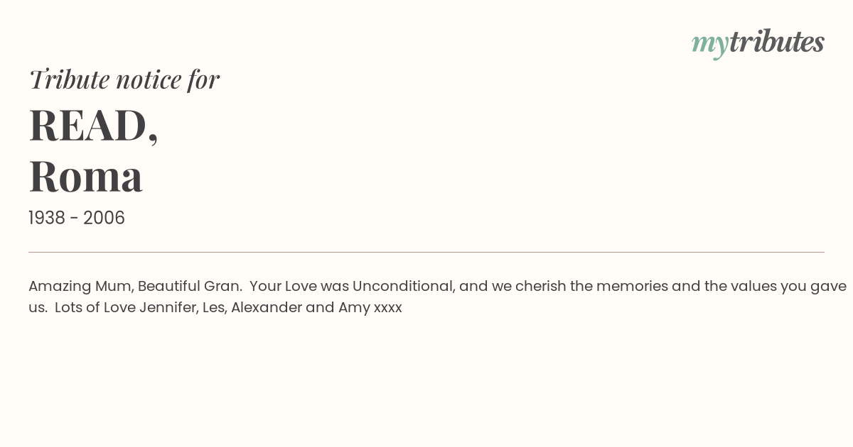 17°CAmazing Mum, Beautiful Gran. Your Love was Unconditional, and we cherish the memories and the values you gave us. Lots of Love Jennifer, Les, Alexander and Amy xxxx