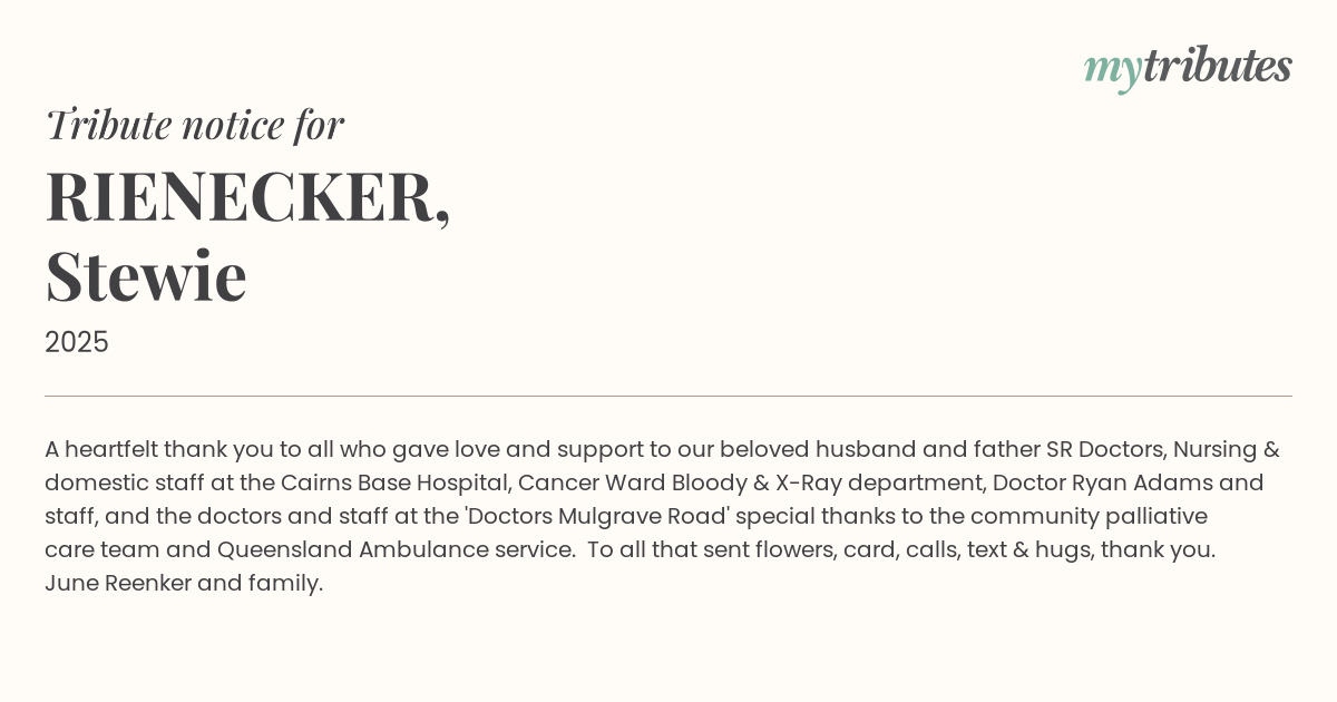 17°CA heartfelt thank you to all who gave love and support to our beloved husband and father SR Doctors, Nursing & domestic staff at the Cairns Base Hospital, Cancer Ward Bloody & X-Ray department, Doctor Ryan Adams and staff, and the doctors and staff at the 'Doctors Mulgrave Road' special thanks to the community palliative care team and Queensland Ambulance service. To all that sent flowers, card, calls, text & hugs, thank you. June Reenker and family.