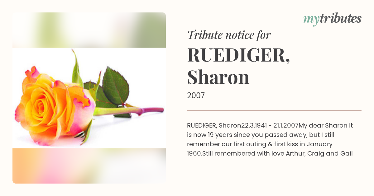 My dear Sharon it is now 19 years since you passed away, but I still remember our first outing & first kiss in January 1960.