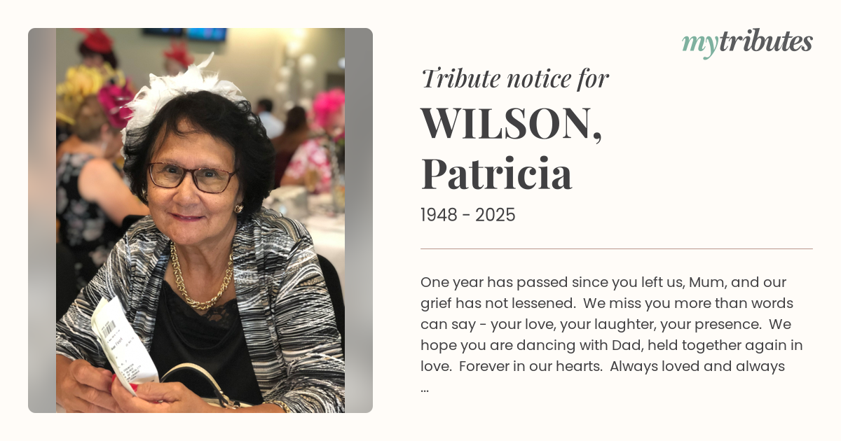 17°COne year has passed since you left us, Mum, and our grief has not lessened. We miss you more than words can say - your love, your laughter, your presence. We hope you are dancing with Dad, held together again in love. Forever in our hearts. Always loved and always missed. Fiona, Glennys, Veronica and families