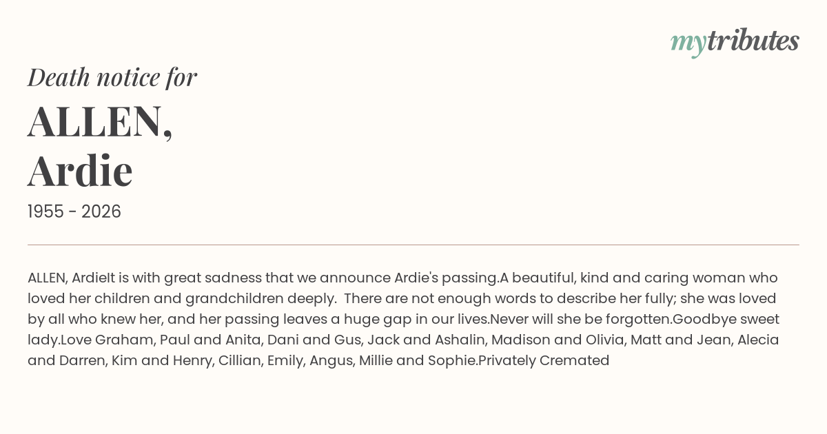 A beautiful, kind and caring woman who loved her children and grandchildren deeply.