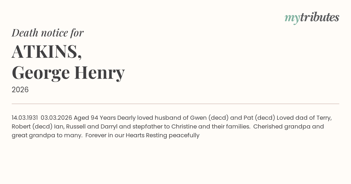 17°C14.03.1931 – 03.03.2026 Aged 94 Years Dearly loved husband of Gwen (dec’d) and Pat (dec’d) Loved dad of Terry, Robert (dec’d) Ian, Russell and Darryl and stepfather to Christine and their families. Cherished grandpa and great grandpa to many. “Forever in our Hearts Resting peacefully”