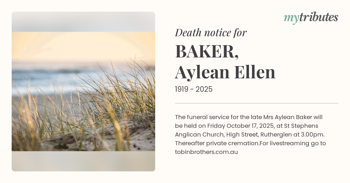 17°CThe funeral service for the late Mrs Aylean Baker will be held on Friday October 17, 2025, at St Stephen’s Anglican Church, High Street, Rutherglen at 3.00pm. Thereafter private cremation.