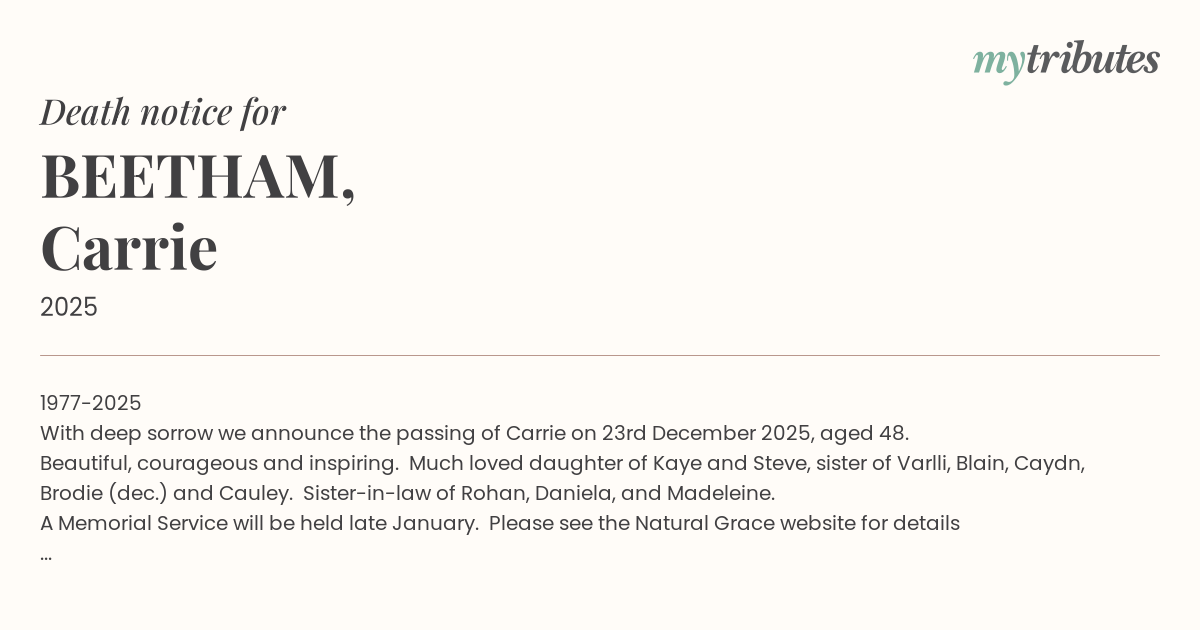 With deep sorrow we announce the passing of Carrie on 23rd December 2025, aged 48.