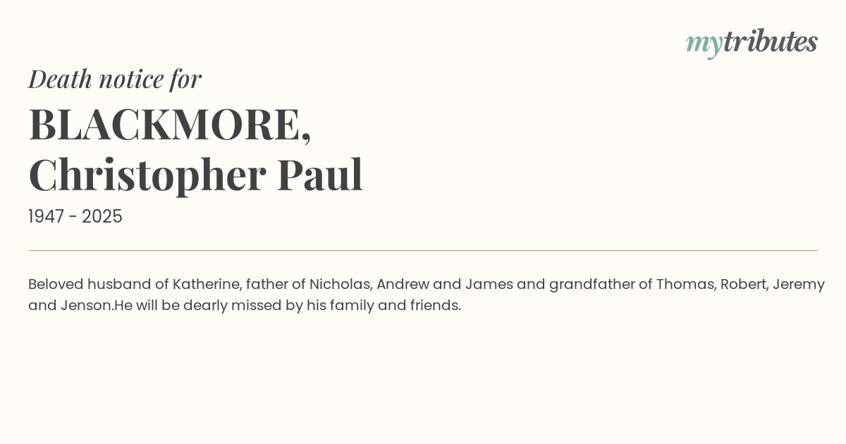 17°CBeloved husband of Katherine, father of Nicholas, Andrew and James and grandfather of Thomas, Robert, Jeremy and Jenson.