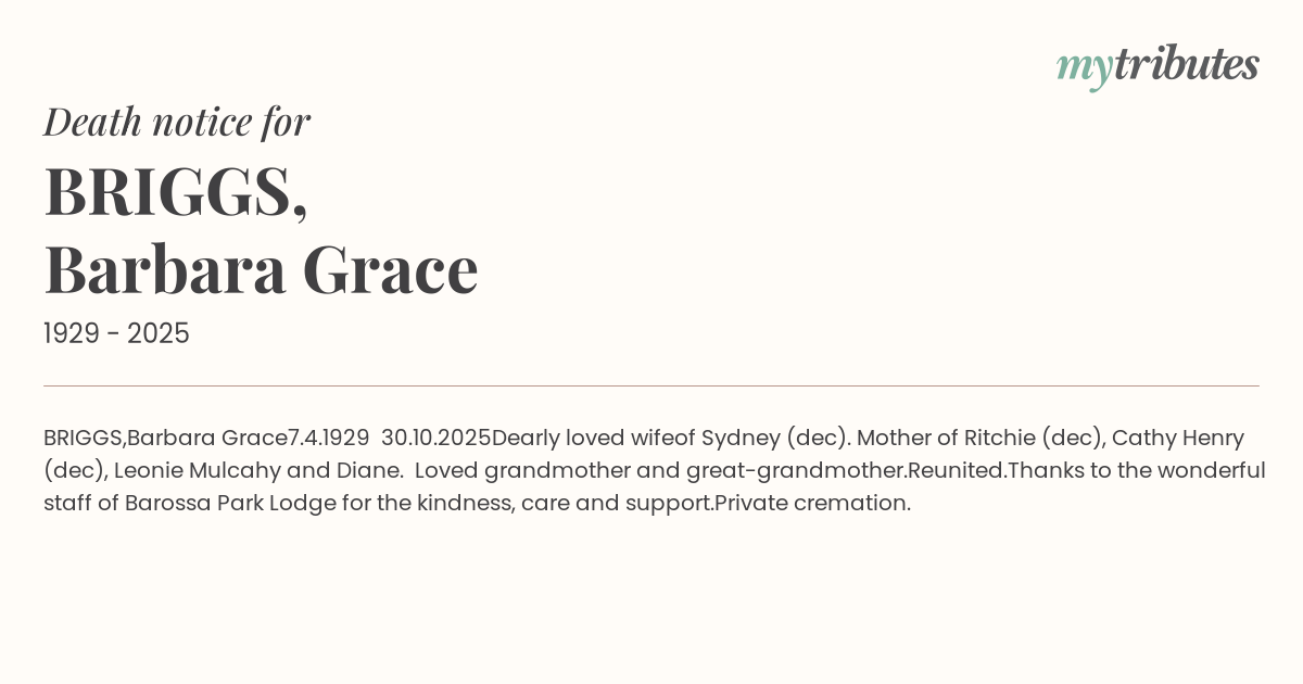 of Sydney (dec). Mother of Ritchie (dec), Cathy Henry (dec), Leonie Mulcahy and Diane. Loved grandmother and great-grandmother.
