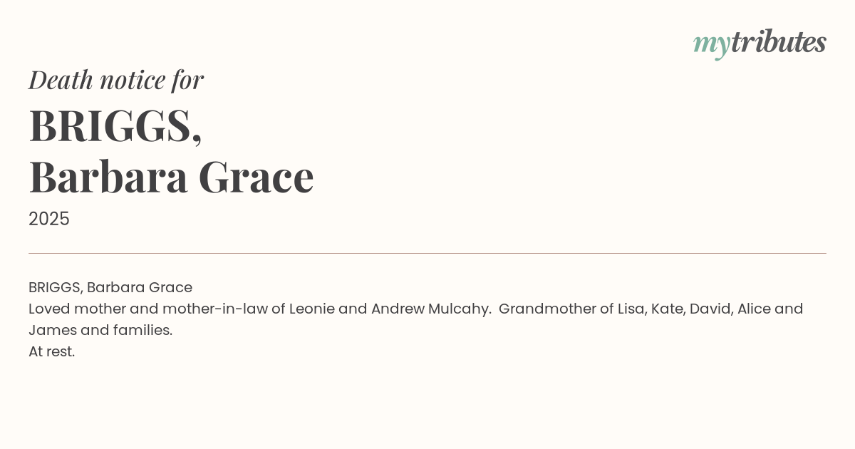 Loved mother and mother-in-law of Leonie and Andrew Mulcahy. Grandmother of Lisa, Kate, David, Alice and James and families.