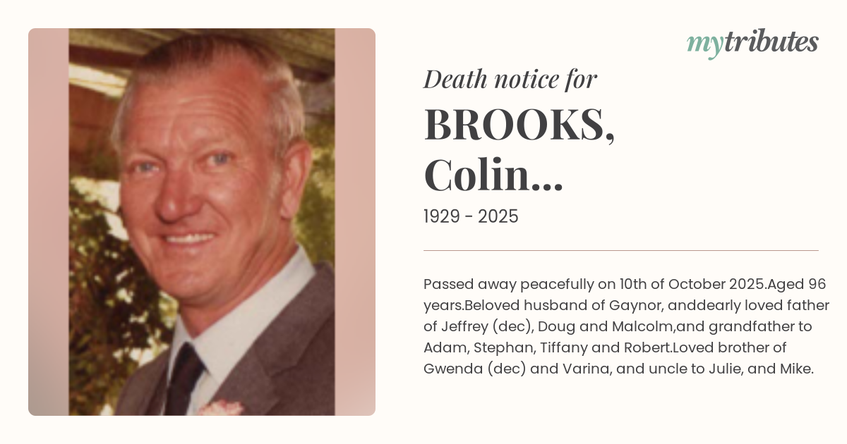Loved brother of Gwenda (dec) and Varina, and uncle to Julie, and Mike.