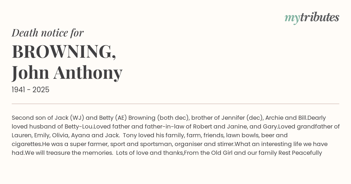 Tony loved his family, farm, friends, lawn bowls, beer and cigarettes.