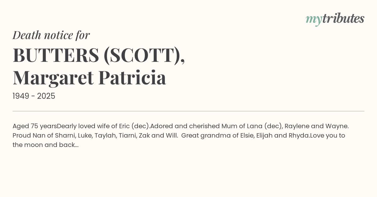 Adored and cherished Mum of Lana (dec), Raylene and Wayne. Proud Nan of Sharni, Luke, Taylah, Tiarni, Zak and Will.