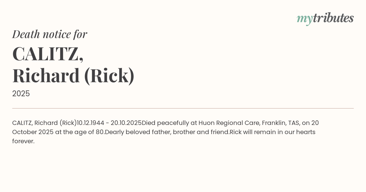 Died peacefully at Huon Regional Care, Franklin, TAS, on 20 October 2025 at the age of 80.