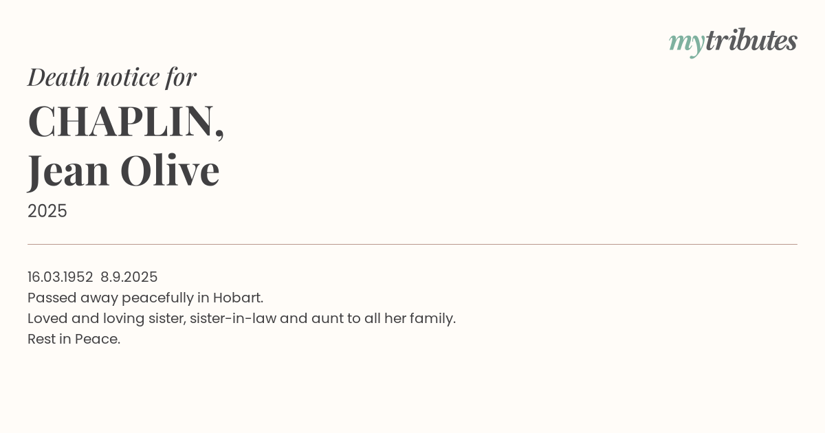 17°C16.03.1952 – 8.9.2025 Passed away peacefully in Hobart. Loved and loving sister, sister-in-law and aunt to all her family. Rest in Peace.