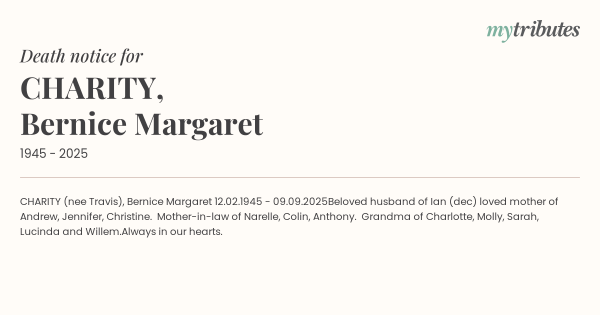 Beloved husband of Ian (dec) loved mother of Andrew, Jennifer, Christine. Mother-in-law of Narelle, Colin, Anthony. Grandma of Charlotte, Molly, Sarah, Lucinda and Willem.