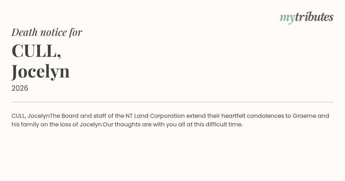 The Board and staff of the NT Land Corporation extend their heartfelt condolences to Graeme and his family on the loss of Jocelyn.