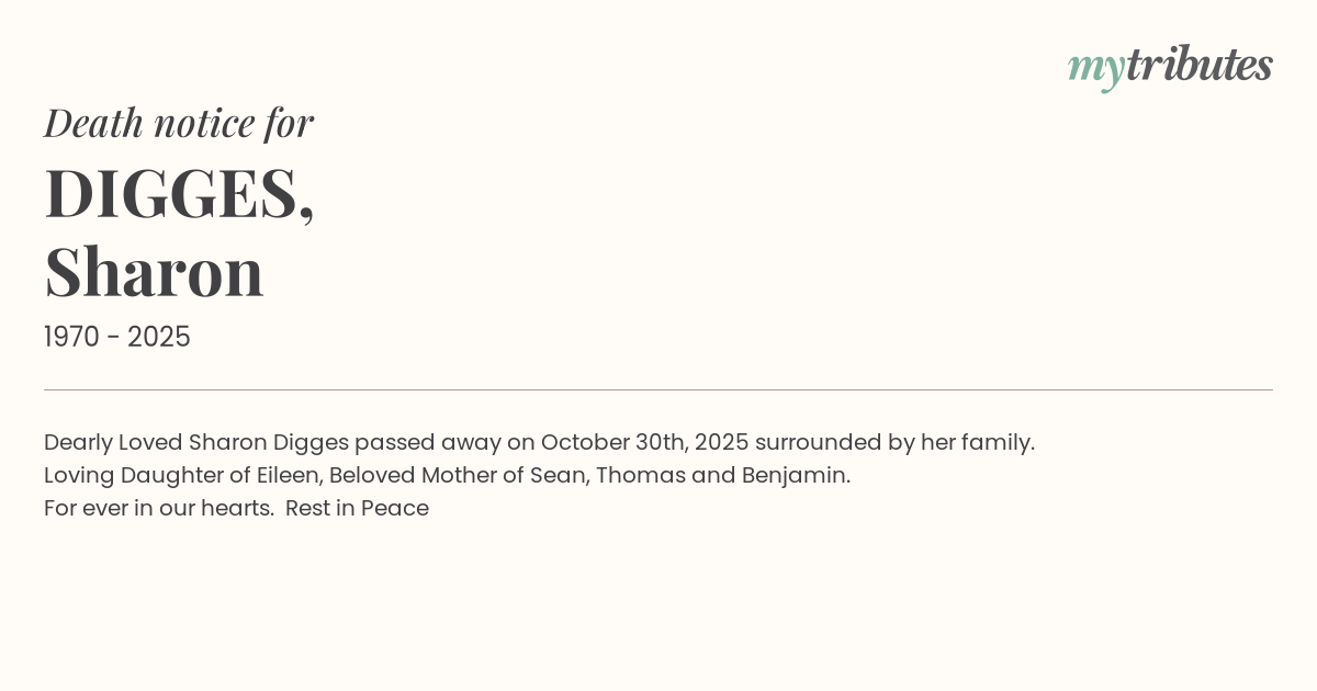 17°CDearly Loved Sharon Digges passed away on October 30th, 2025 surrounded by her family. Loving Daughter of Eileen, Beloved Mother of Sean, Thomas and Benjamin. For ever in our hearts. Rest in Peace