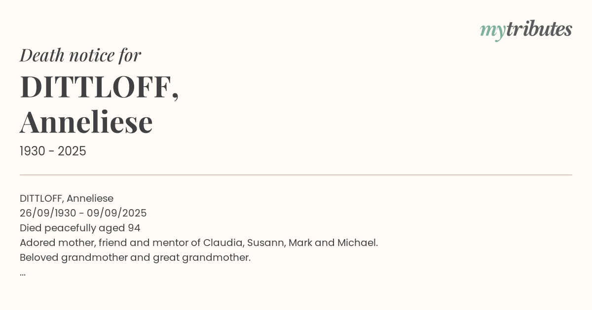 Adored mother, friend and mentor of Claudia, Susann, Mark and Michael.