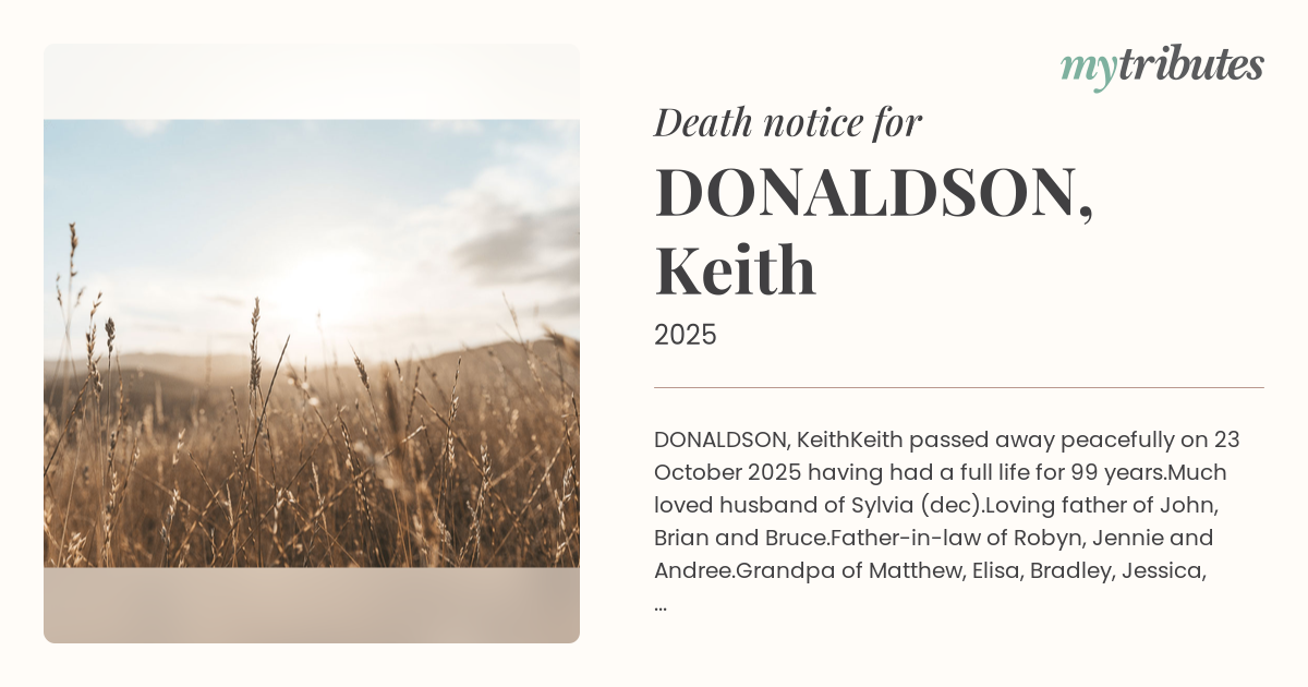 Keith passed away peacefully on 23 October 2025 having had a full life for 99 years.