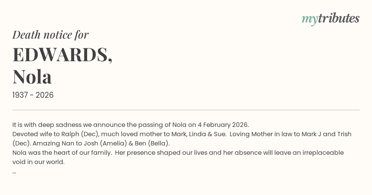 17°CIt is with deep sadness we announce the passing of Nola on 4 February 2026.