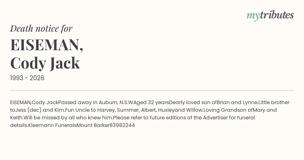 Please refer to future editions of the Advertiser for funeral details.