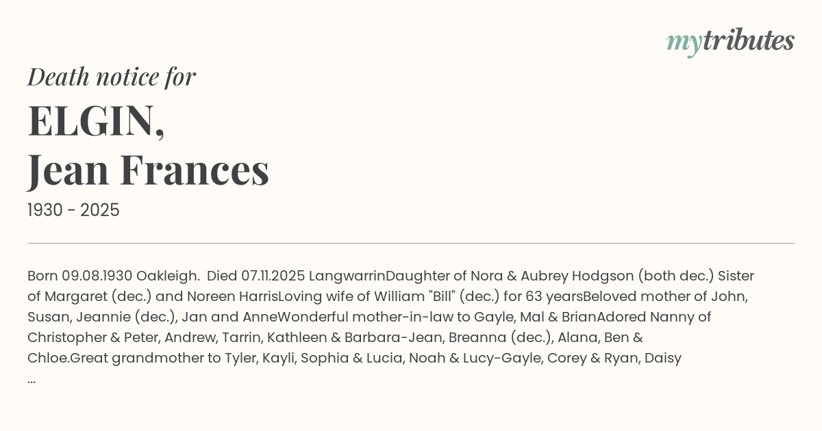 17°CBorn 09.08.1930 Oakleigh. Died 07.11.2025 Langwarrin