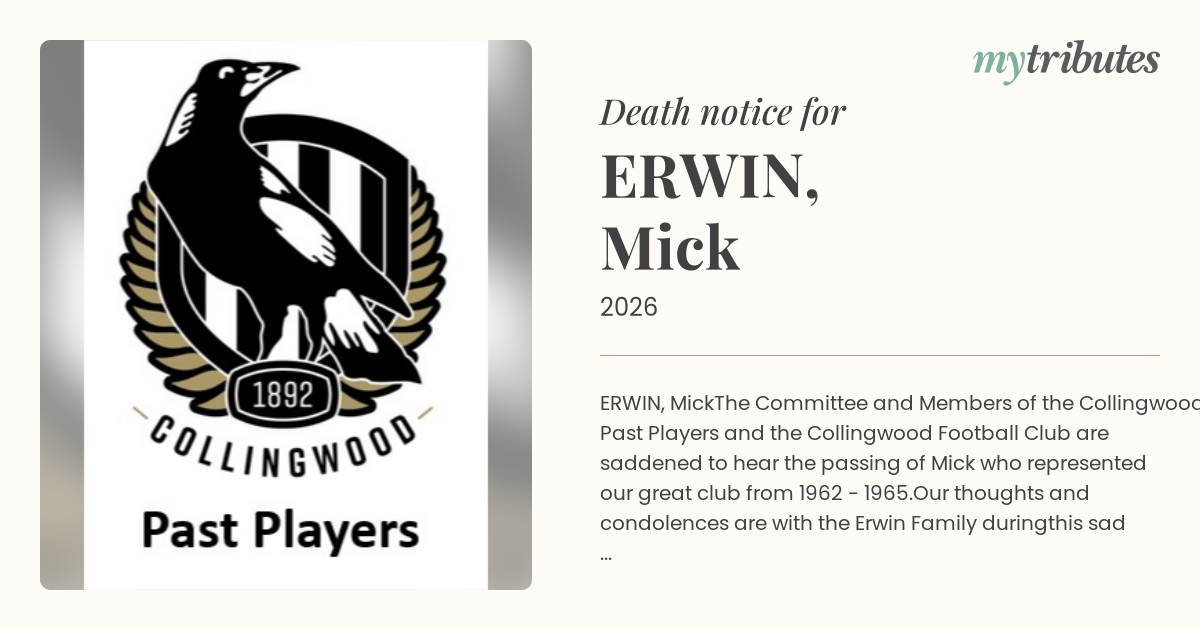 The Committee and Members of the Collingwood Past Players and the Collingwood Football Club are saddened to hear the passing of Mick who represented our great club from 1962 - 1965.