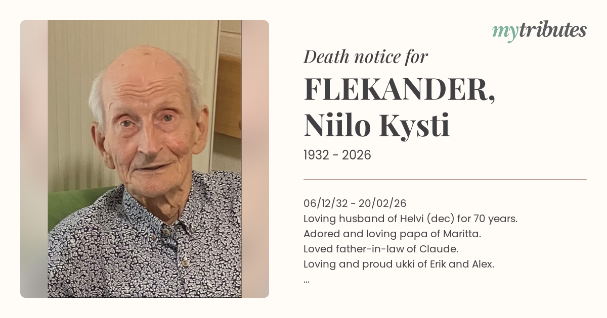 Loving husband of Helvi (dec) for 70 years.
