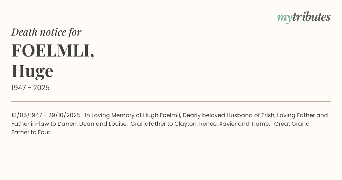 17°C18/05/1947 - 29/10/2025 In Loving Memory of Hugh Foelmli, Dearly beloved Husband of Trish, Loving Father and Father in-law to Darren, Dean and Louise. Grandfather to Clayton, Renee, Xavier and Tiarne. Great Grand Father to Four.