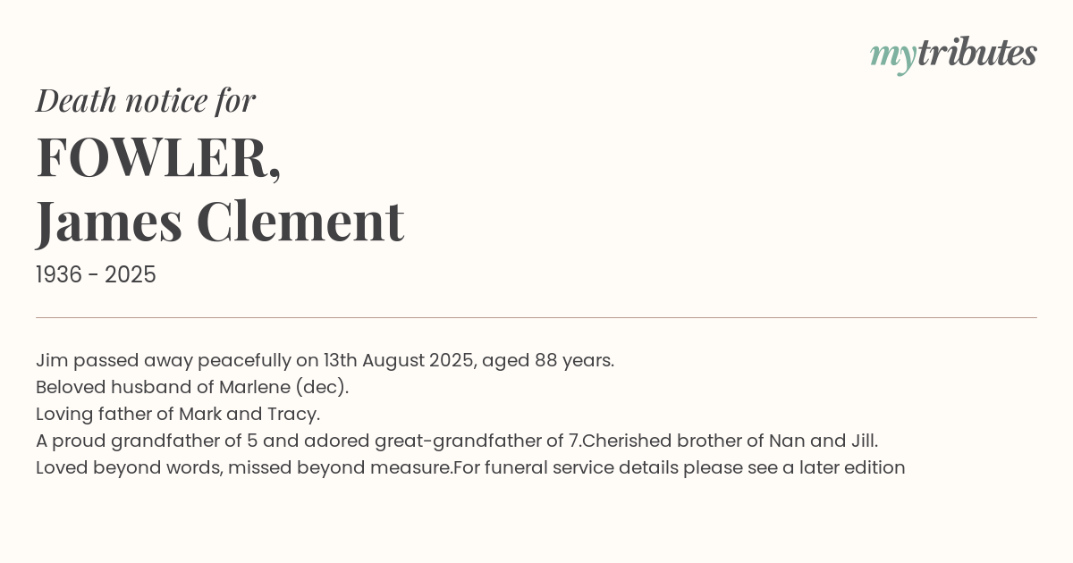 17°CJim passed away peacefully on 13th August 2025, aged 88 years. Beloved husband of Marlene (dec). Loving father of Mark and Tracy. A proud grandfather of 5 and adored great-grandfather of 7.