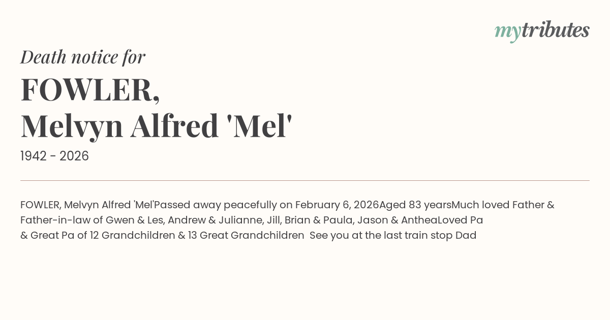 17°CFOWLER, Melvyn Alfred 'Mel'