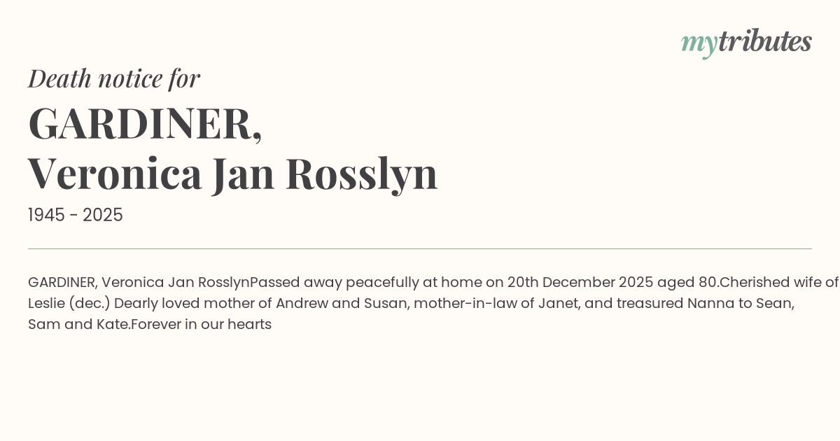 Cherished wife of Leslie (dec.) Dearly loved mother of Andrew and Susan, mother-in-law of Janet, and treasured Nanna to Sean, Sam and Kate.
