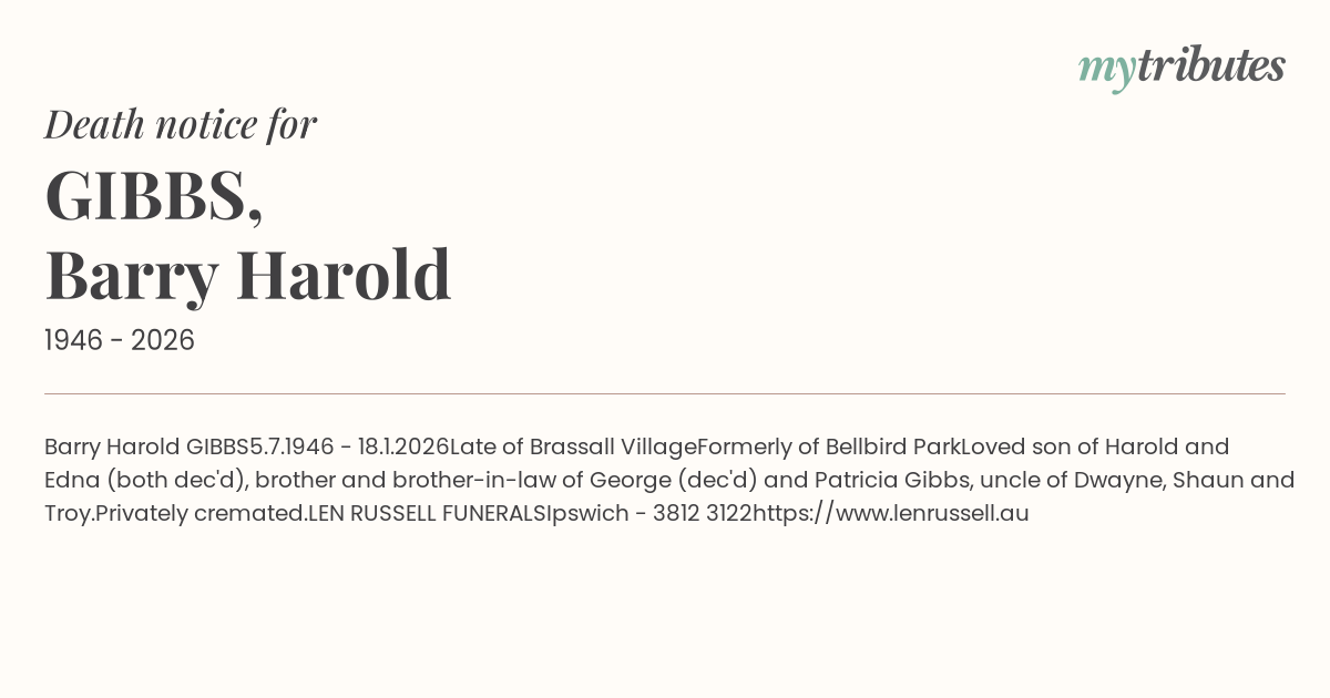 Loved son of Harold and Edna (both dec'd), brother and brother-in-law of George (dec'd) and Patricia Gibbs, uncle of Dwayne, Shaun and Troy.