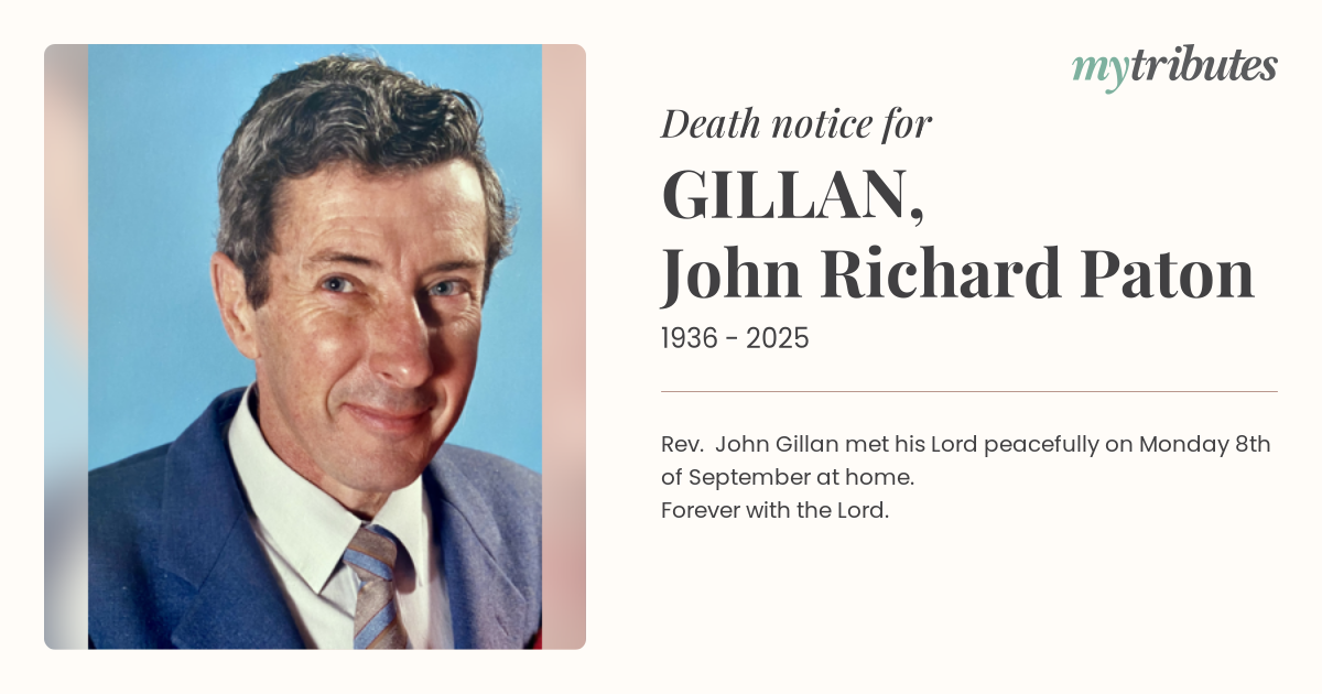 17°CRev. John Gillan met his Lord peacefully on Monday 8th of September at home.