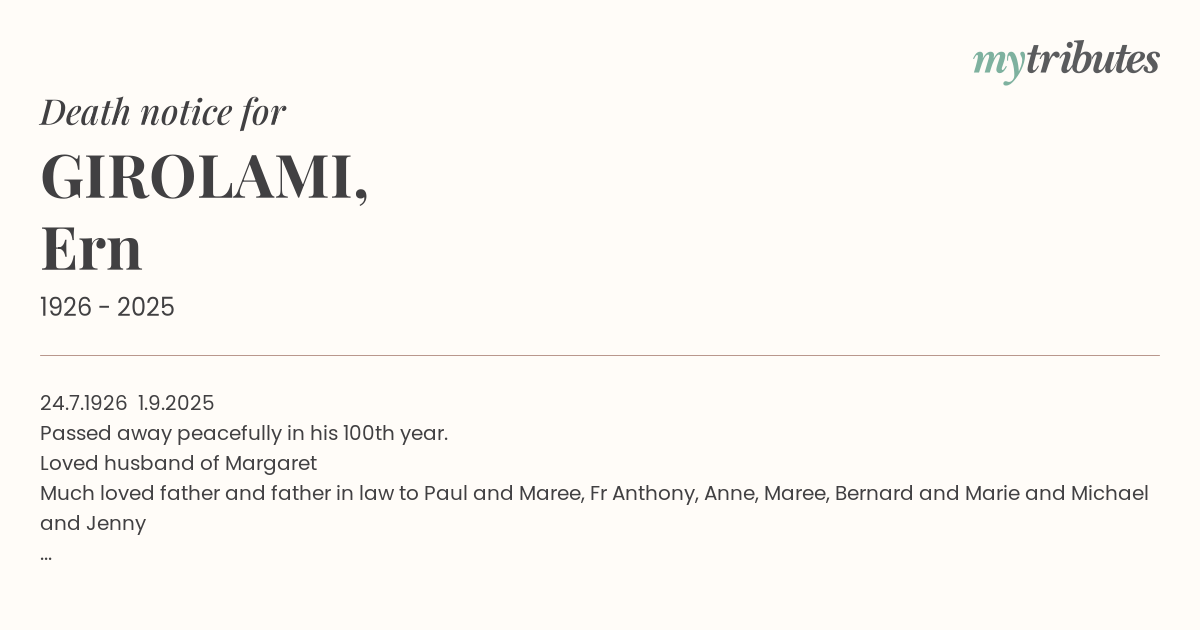 17°C24.7.1926 – 1.9.2025 Passed away peacefully in his 100th year. Loved husband of Margaret Much loved father and father in law to Paul and Maree, Fr Anthony, Anne, Maree, Bernard and Marie and Michael and Jenny Dearly loved grandfather to Andrew and Amy, Luke, Daniel and Kerrie, James and Kate, Mark and Laura, Kaitlyn and Jacob, Georgia, Matthew, Stephanie and Megan Besotted great grandfather of Lenny A long and fruitful life. A ‘Roy boy forever. Requiescat in Pace