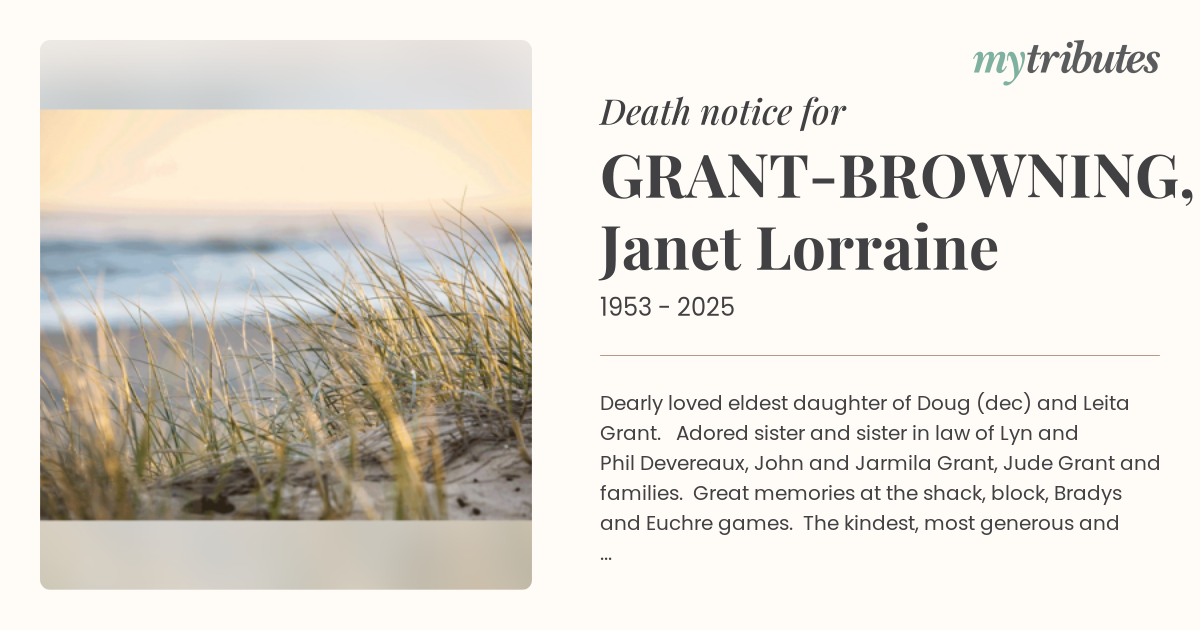 17°CDearly loved eldest daughter of Doug (dec) and Leita Grant. Adored sister and sister in law of Lyn and Phil Devereaux, John and Jarmila Grant, Jude Grant and families. Great memories at the shack, block, Brady’s and Euchre games. The kindest, most generous and bravest daughter and sister. Jan will be loved and missed every day. Ta Da Dick.