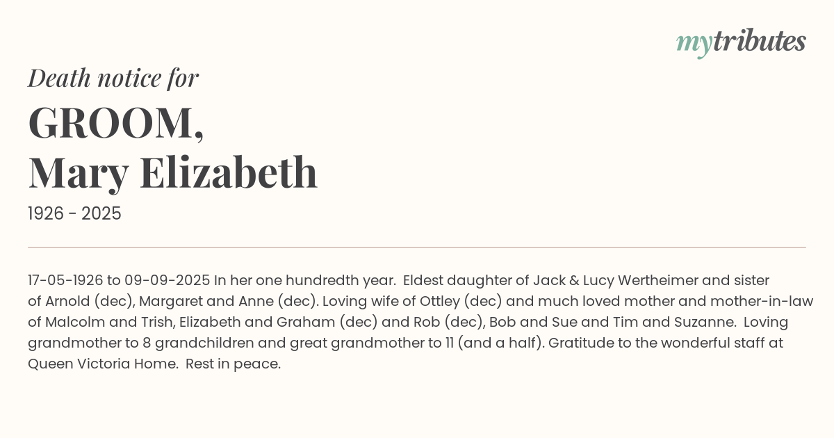 Loving wife of Ottley (dec) and much loved mother and mother-in-law of Malcolm and Trish, Elizabeth and Graham (dec) and Rob (dec), Bob and Sue and Tim and Suzanne.