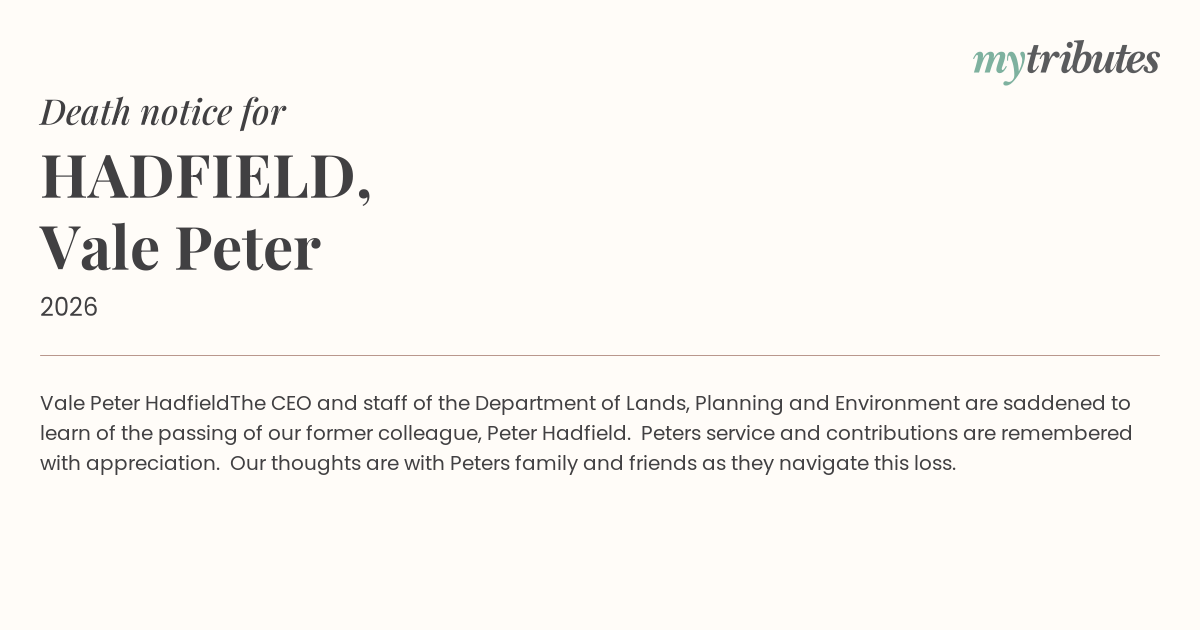 The CEO and staff of the Department of Lands, Planning and Environment are saddened to learn of the passing of our former colleague, Peter Hadfield. Peter’s service and contributions are remembered with appreciation. Our thoughts are with Peter’s family and friends as they navigate this loss.