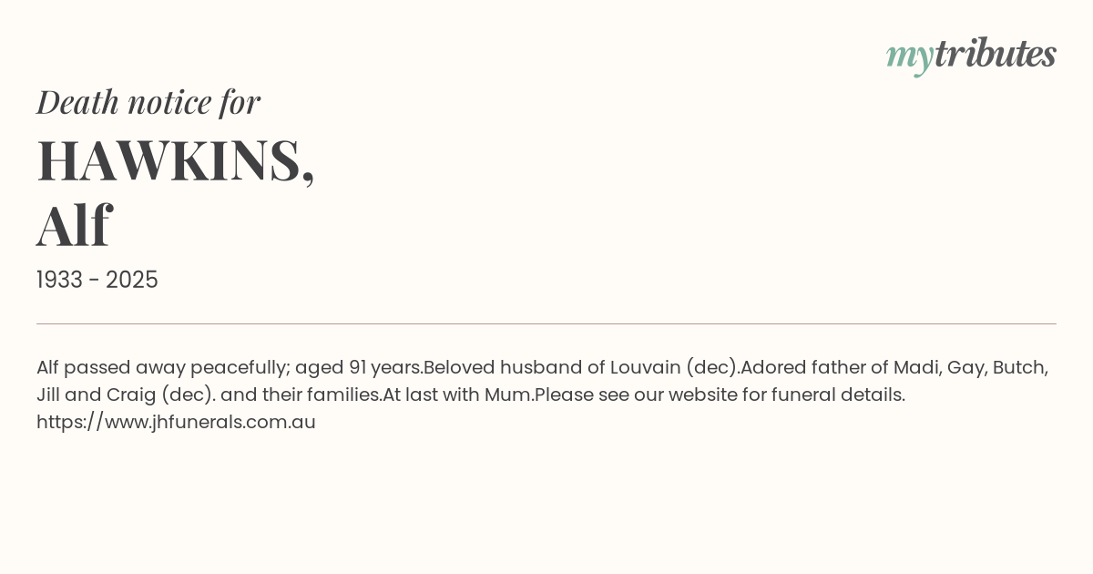 Please see our website for funeral details. https://www.jhfunerals.com.au
