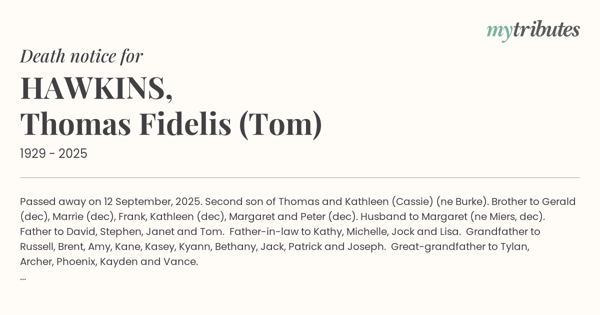 17°CPassed away on 12 September, 2025. Second son of Thomas and Kathleen (Cassie) (née Burke). Brother to Gerald (dec), Marrie (dec), Frank, Kathleen (dec), Margaret and Peter (dec). Husband to Margaret (née Miers, dec). Father to David, Stephen, Janet and Tom. Father-in-law to Kathy, Michelle, Jock and Lisa. Grandfather to Russell, Brent, Amy, Kane, Kasey, Kyann, Bethany, Jack, Patrick and Joseph. Great-grandfather to Tylan, Archer, Phoenix, Kayden and Vance.